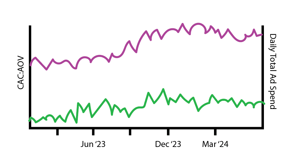 This is further evidence that the brand’s media strategy isn’t driving incremental new customer sales. Next, I’ll chart total ad spend against CAC:AOV: