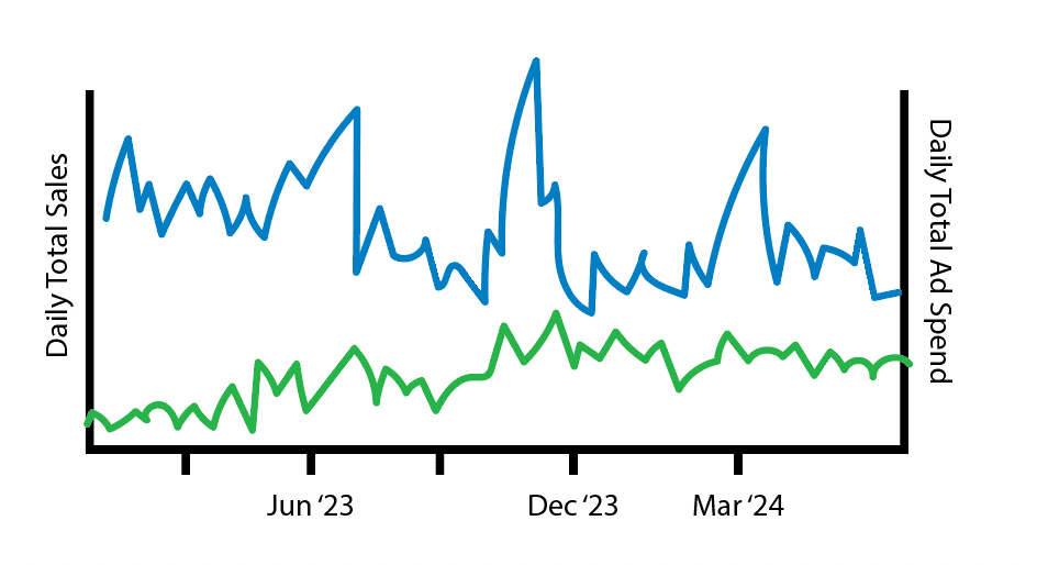 The next thing I look at is the rolling 30 day trend in ad spend vs sales over the past 12-18 months. I want to answer a few questions: